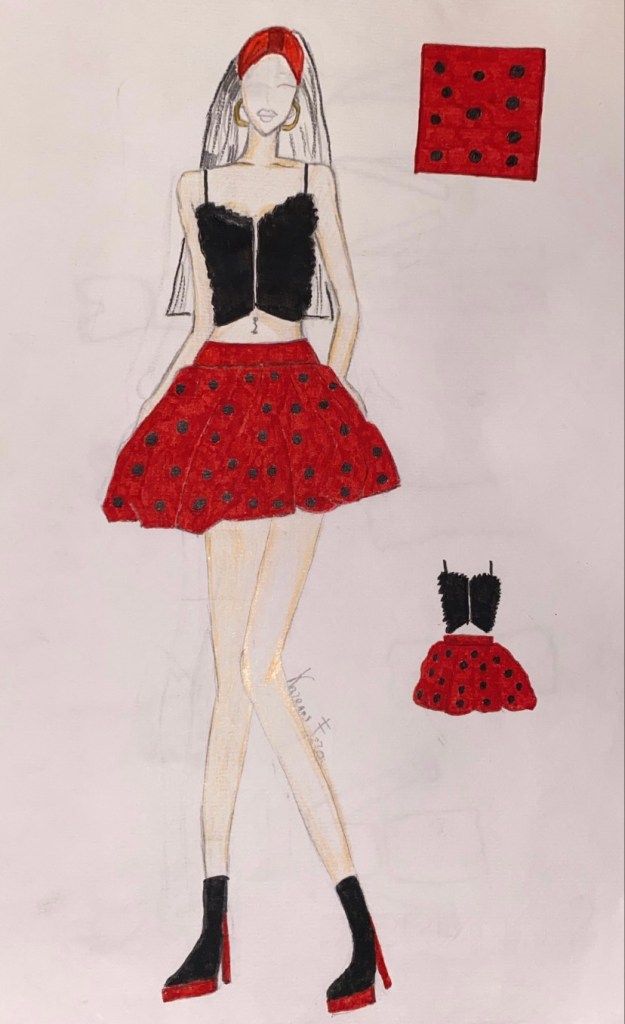 Gonna a ruota rossa in cotone con fantasia a pois. Abbinato con stivaletti neri lucidi con tacco a spillo e un leggero rialzo rosso.